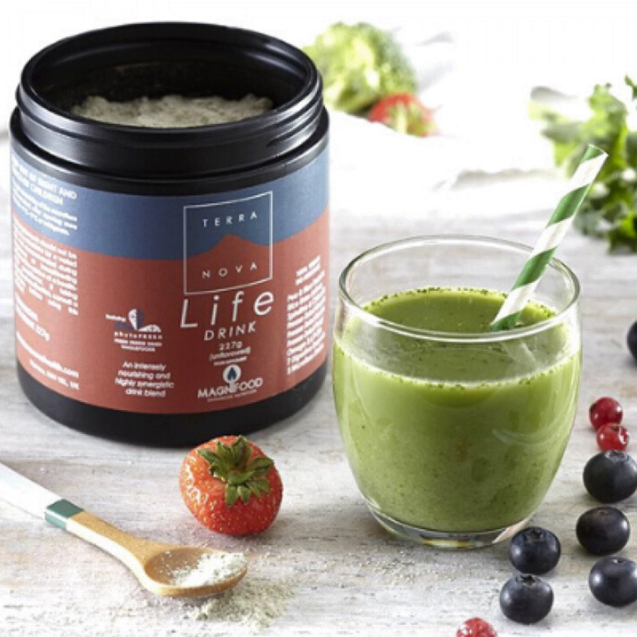 Life Drink from Terranova provides the perfect instant addition to a healthy diet. This is perhaps the best nutritional supplement in the world for the perfect start to your day. All you need to do to use the powerful ingredients is mix a scoop of the powder with juice or a smoothie, and enjoy all the benefits. The powder is deeply nourishing. It consists of a blend of plant proteins, extracts of berries, vegetables (including some so-called super greens), mushrooms and algae, omega fatty acids, good gut bacteria (probiotics) and digestive enzymes. Through the freshly freeze-dried, unadulterated botanicals and other natural active ingredients, Life Drink offers a dizzying array of natural phytonutrients, micronutrients, balanced proteins, enzymes, microflora, essential fatty acids, fibre and much more. These work together to support your natural and balanced lifestyle. The product is 100% natural and free from fillers and additives.