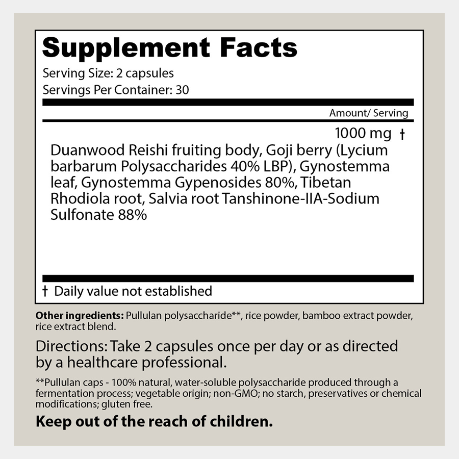 Extrait de fructification de Duanwood reishi, extrait de baie de goji (standardisé à 40 % de LBP), extrait de feuille de gynostemma (standardisé à 80 % de gypénosides), extrait de racine de rhodiola du Tibet, polysaccharide de pullulane (capsule végétale) et charges (poudre de riz, poudre d'extrait de bambou, riz extrait du mélange).